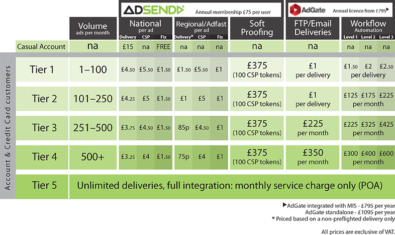 With an AdGate licence, Adsend can also cover your email and ftp deliveries for all titles not supported directly through Adsend. This feature makes Adsend the ideal platform for all your ad deliveries, offering you a central management service for submitting and tracking all your campaigns from as little as £1 per delivery. Fixed cost monthly packages are also available bringing the price down as the volume increases.